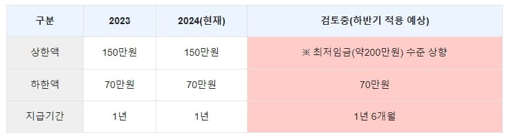 국회에서 지급기간을 1년 6개월로 연장하고 , 지급 금액 상한선 또한 최저임금인 200만원 까지 상향하자는 논의가 진행되고 있지만 아직 까지 결정된 사항은 없습니다. 다만 일각에서는 하반기 부터 적용이 될 수 있다는 의견이 있습니다.