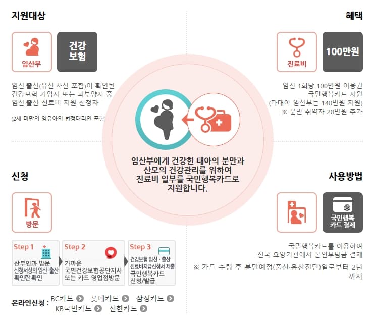 출산지원금 신청은 임산부 본인 혹은 그 가족이 가능하며, 국민건강보험 공단 지사 방문 혹은 복지로 홈페이지에서 신청이 가능합니다.